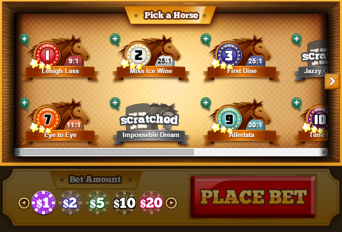 В отличие от букмекерских контор в Лас-Вегасе, в Derby Jackpot каждая гонка проходит по отдельности. Кажется, они чередуются на нескольких разных ипподромах по всей территории Соединенных Штатов. Когда одна гонка заканчивается, нажмите «следующая гонка», и вас перенесет в другую часть страны на следующую гонку. Чтобы сделать игру более социальной, всегда работает чат, где игроки могут оставлять свои отзывы, поздравлять победителей и сочувствовать своим поражениям. Также есть таблица лидеров, в которой указаны десять лучших игроков за день. В этом списке отображаются очки каждого игрока. Как начисляются очки, я понятия не имею.