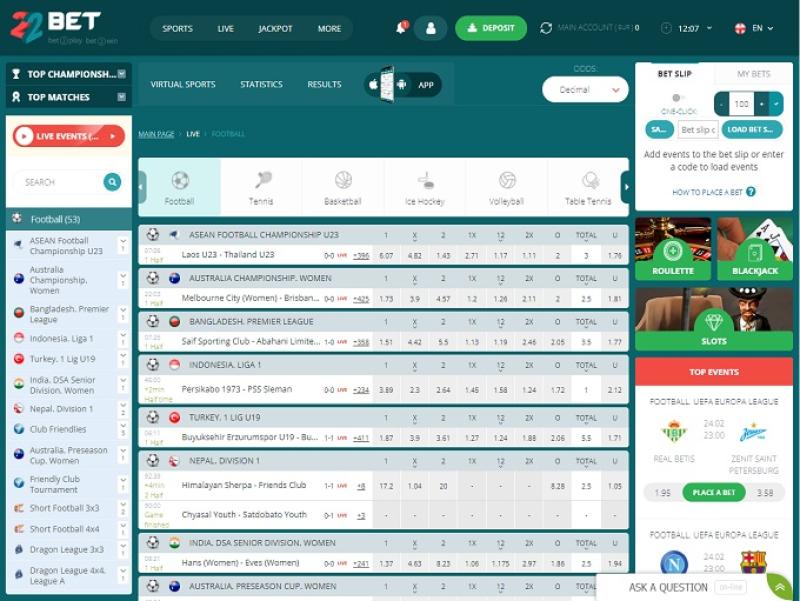 Помимо услуг по ставкам на спорт, на интуитивно понятном сайте 22 Bet также представлено отличное онлайн-казино с такими играми, как: покер, баккара , блэкджек, рулетка, слоты, настольные игры, видеобинго, крэпс , видеопокер, видеослоты и другие настольные игры. Также есть возможность играть в казино с живыми дилерами. Это отличные варианты для тех, кто хочет иметь доступ к классическим играм казино при размещении ставок на спорт. Рассматривайте эту букмекерскую контору/казино как универсальный магазин для всех ваших потребностей и желаний в сфере ставок.