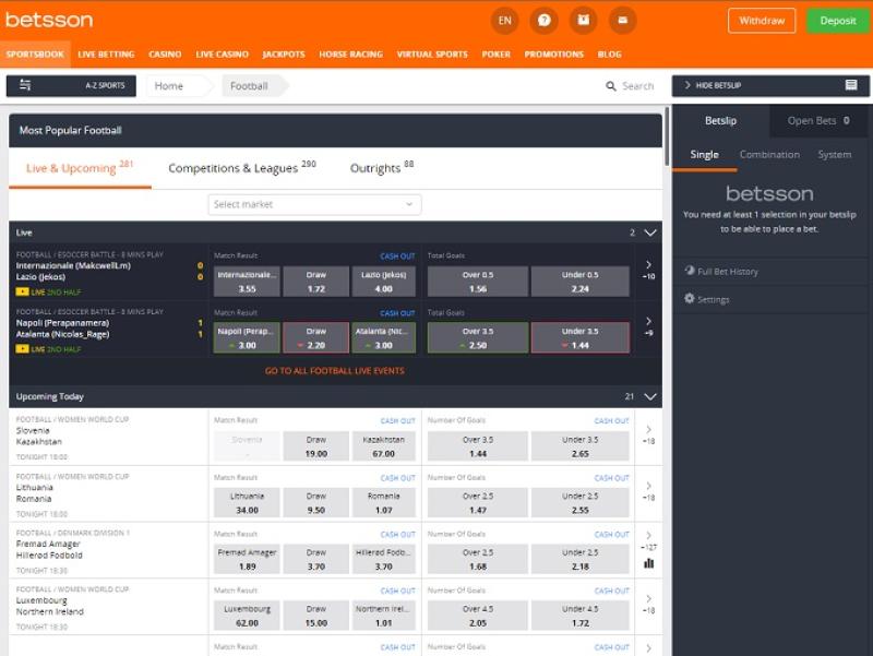 Betsson — это первоклассная онлайн-платформа для азартных игр. Спортивные и казино-игры доступны как на настольных компьютерах, так и на мобильных устройствах. Условия и положения справедливы, как и следовало ожидать от лицензированного оператора с такой многолетней репутацией. Купон ставок и конструктор ставок предлагают полностью настраиваемый интерфейс. Быстрое обслуживание клиентов обеспечивает высокий уровень профессионализма. Введение киберспорта также добавляет еще один уровень развлечения, хотя и довольно простой по сравнению с другими лидерами индустрии.