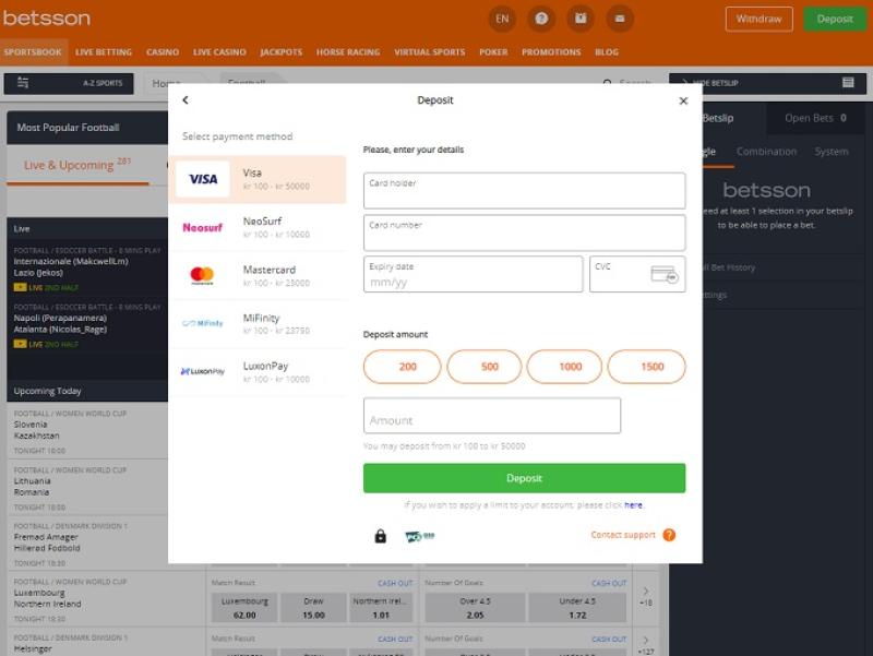 Способы оплаты зависят от доступности в вашей стране. В зависимости от выбранного способа оплаты, минимальная сумма депозита составляет 10 евро. Betsson не взимает комиссию за пополнение счета.