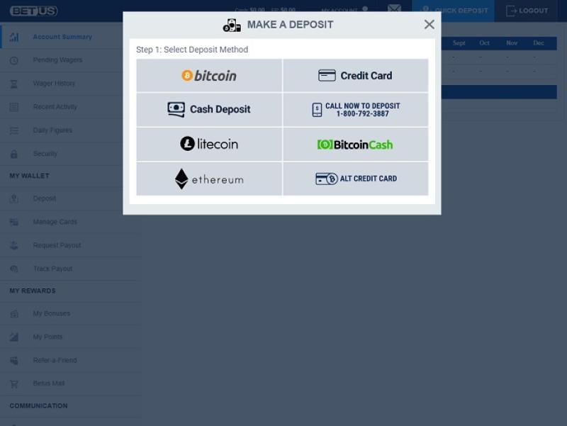 Все транзакции осуществляются в долларах США, а также в криптовалюте. Для карт Visa, Mastercard и American Express минимальный депозит составляет 10 долларов, а максимальный — 2499 долларов. Для криптовалют минимальный депозит составляет 10 долларов, а максимальный — 50 000 долларов. Комиссия за пополнение счета отсутствует, а для банковских переводов необходимо связаться со службой поддержки.