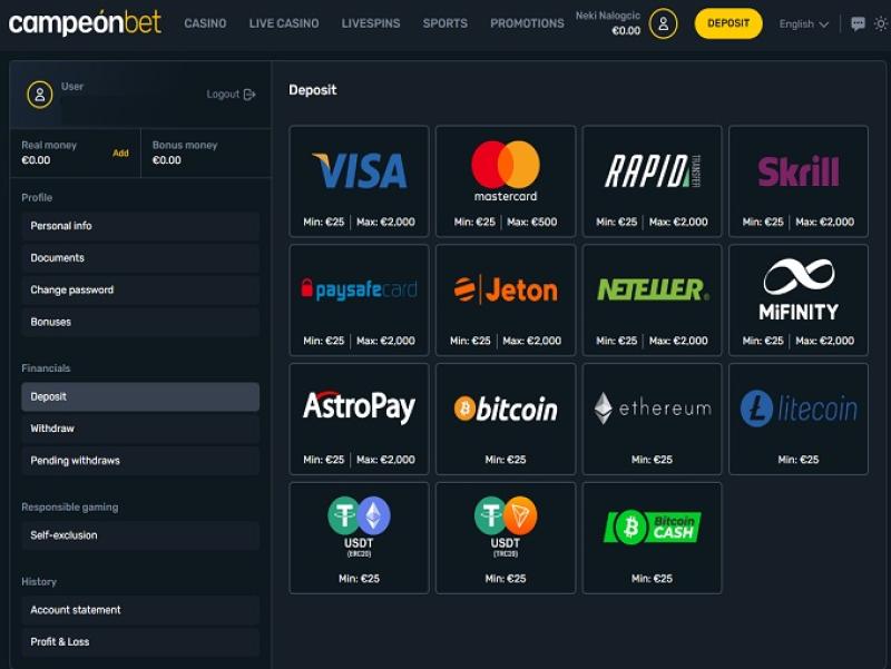 Способы пополнения счета: Visa, Sepa, Neteller, Skrill, Jeton Wallet, Pay Safe Card, Eco Payz, i-Deal, Giro Pay, Much Better, Neo Surf, Safe Charge, E-Pro, E-Voucher, Mi Finity, Rapid Transfer, Bitcoin Cash, Bitcoin, Ethereum и Litecoin.