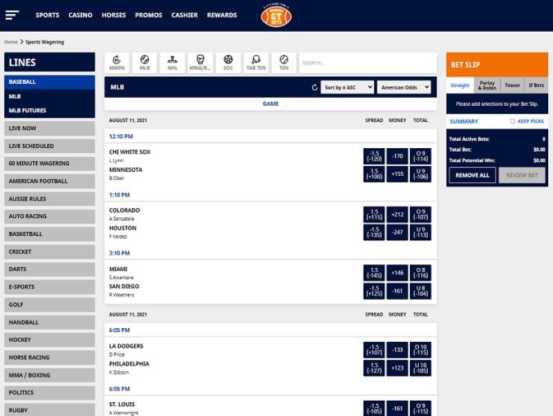GT Bets в первую очередь удобен для ставок на НФЛ , поскольку это его основная специализация, но он также предлагает очень широкий выбор международных спортивных событий для ставок. Среди представленных видов спорта: американский футбол, бейсбол, баскетбол , бокс, крикет, гольф, гандбол, хоккей, ММА, регби, футбол, теннис, волейбол, киберспорт, студенческий спорт и политика. Они предоставляют возможность делать ставки в режиме реального времени или во время игры, позволяя пользователям делать ставки на матчи, которые уже идут.