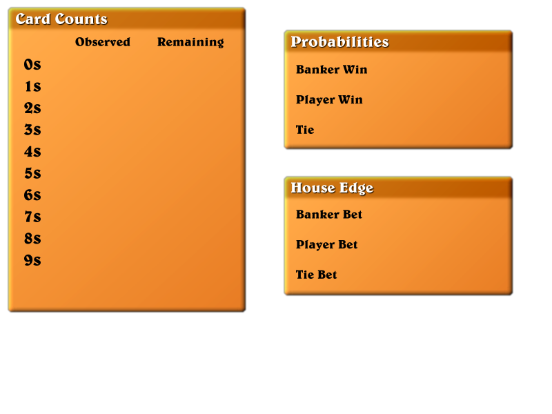 - Ознакомьтесь с нашей статистической таблицей, чтобы увидеть сводку по последней раздаче. Здесь вы найдете процент ставок на Банкира, Игрока и Ничью. Вы также получите то, чего не предоставит ни одно казино: преимущество казино по тем же трем ставкам, основанное на точном составе оставшихся карт. Иногда преимущество оказывается у игрока на поздних этапах раздачи. Наконец, для тех, кто считает карты, мы упростим задачу, показав, сколько карт каждого ранга осталось в раздаче.