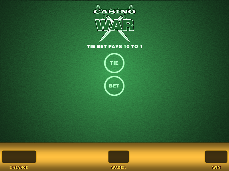Далее представлена игра «Война в казино» . Для игры необходимо сделать основную ставку, а также, по желанию, ставку на ничью . После размещения ставки (ставок) вам раздадут по одной карте, а дилеру — по одной карте; выигрывает старшая карта (тузы — старшие). В случае ничьей ставка на ничью (если она была сделана) выплачивается в соотношении 10 к 1, и вам предоставляется выбор: сдаться или вступить в войну. Если вы сдаетесь, вы теряете половину своей основной ставки, и игра заканчивается. Если вы вступаете в войну, вы должны сделать еще одну ставку, равную вашей основной ставке, после чего вы и дилер получаете еще одну карту. Вы выигрываете войну, если ваша вторая карта равна или выше второй карты дилера. В случае вашей победы ваша основная ставка выплачивается в равных суммах, а если вы вступили в войну, дополнительная ставка идет вровень.