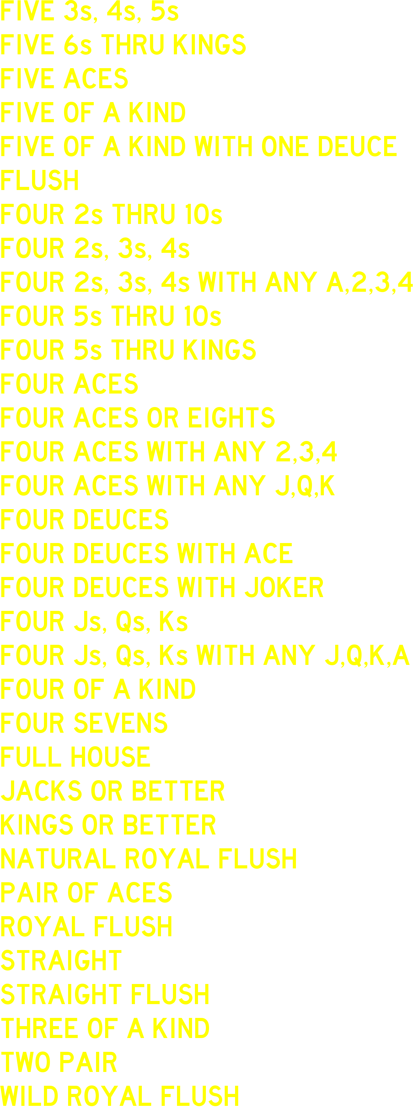 - «Двойки в качестве джокеров» : В этом варианте все двойки выступают в роли джокеров, то есть они могут заменить любую карту для составления выигрышной комбинации. Добавление джокеров упрощает формирование выигрышных комбинаций, но также изменяет структуру выплат, как правило, снижая доходность менее ценных комбинаций.
