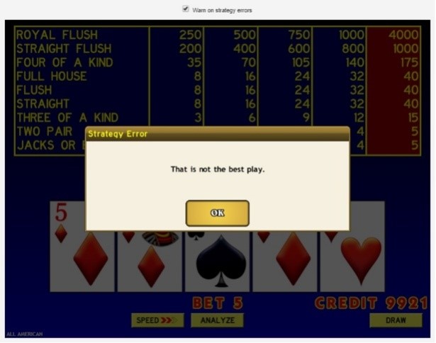При активации окна «Предупреждение об ошибках стратегии», расположенного прямо над игровым интерфейсом, будет появляться всплывающее окно всякий раз, когда можно сделать более выгодный ход. Таким образом, эта функция полезна для изучения основ покера в целом , а также игры All American.