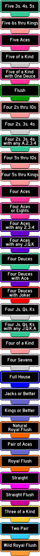 Одна из самых распространенных игр в видеопокер в любом казино, сама по себе не нуждается в особом представлении или обзоре. Разделяя основные принципы с другими играми семейства бонусных покеров, цель та же: использовать пять карт, розданных из одной колоды в 52 карты, удерживать хорошие карты, пытаясь собрать лучшую комбинацию, и обыграть дилера. Что отличает Bonus Poker от остальных, так это ожидаемая доходность в 99,17% при грамотной стратегии.