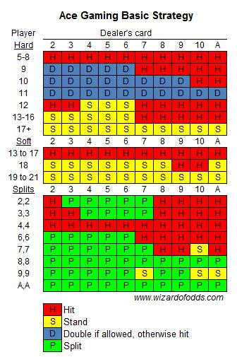 Мой совет — играйте в игру с одной колодой, не делая дополнительных ставок, которые могут вас соблазнить. Я прилагаю скриншот с базовой стратегией игры с одной колодой. Щелкните по нему, чтобы увеличить изображение.