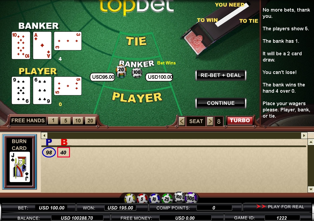 Правила и коэффициенты стандартные. Используется восемь колод, а ничья оплачивается по обычному скудному коэффициенту 8 к 1.