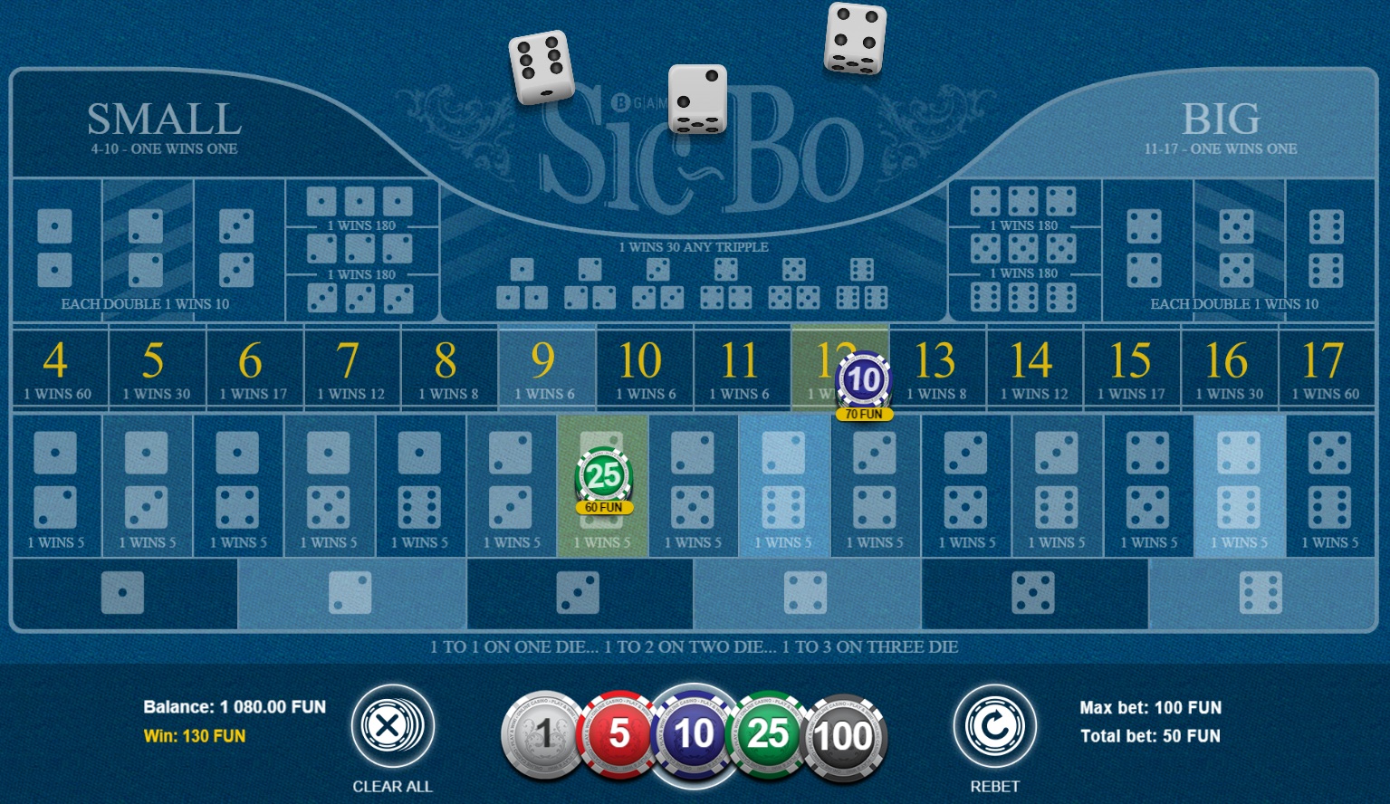 Это простая лотерейная игра с тремя кубиками. Процентная ставка казино составляет 2,78%. Более подробную информацию вы найдете на моей странице, посвященной лотерейным играм с кубиками .