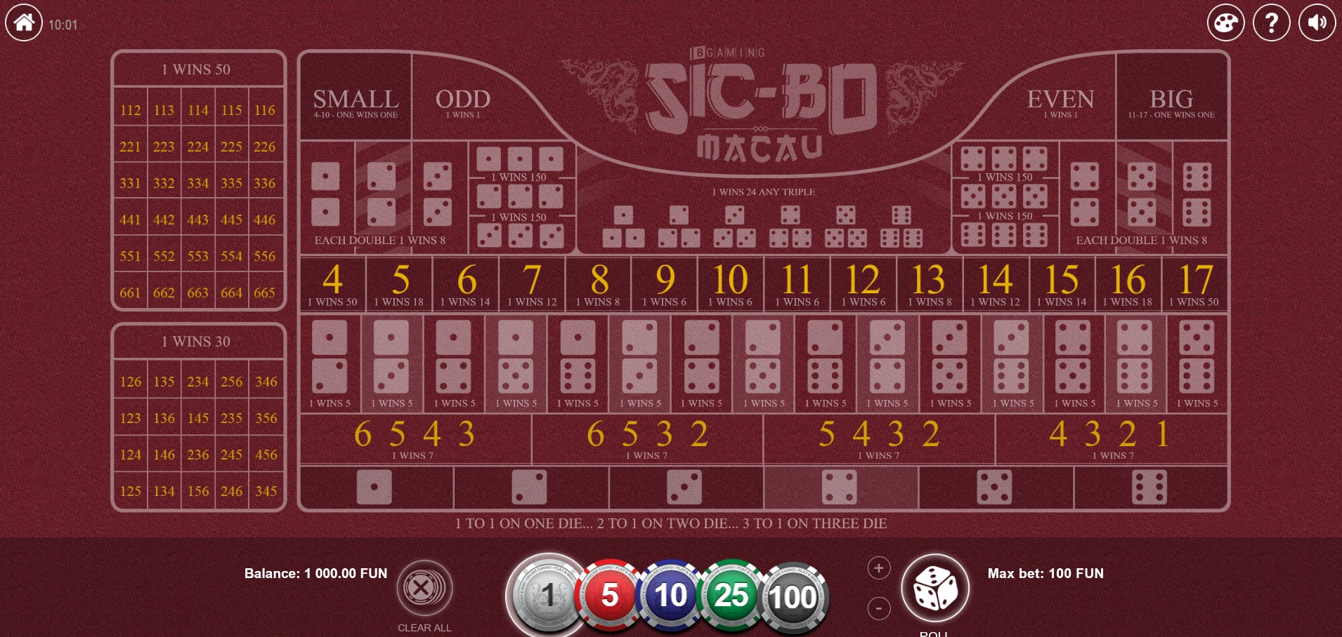 Bgaming предлагает две игры в сик-бо. Та, что на синем столе, называется просто «сик-бо», а та, что на красном столе, называется «сик-бо Макао». Мне нравится, что они пишут «Макао» с окончанием «ау» (вместо «о»), но мне не нравится, как они пишут «сик-бо» через дефис. Шансы в обеих играх довольно низкие, но в игре «Макао» они ещё хуже. На самом деле, я должен их раскритиковать за то, что они выплачивают всего 18 к 1 на ставки 5 и 16, что составляет преимущество казино в 47,22%!