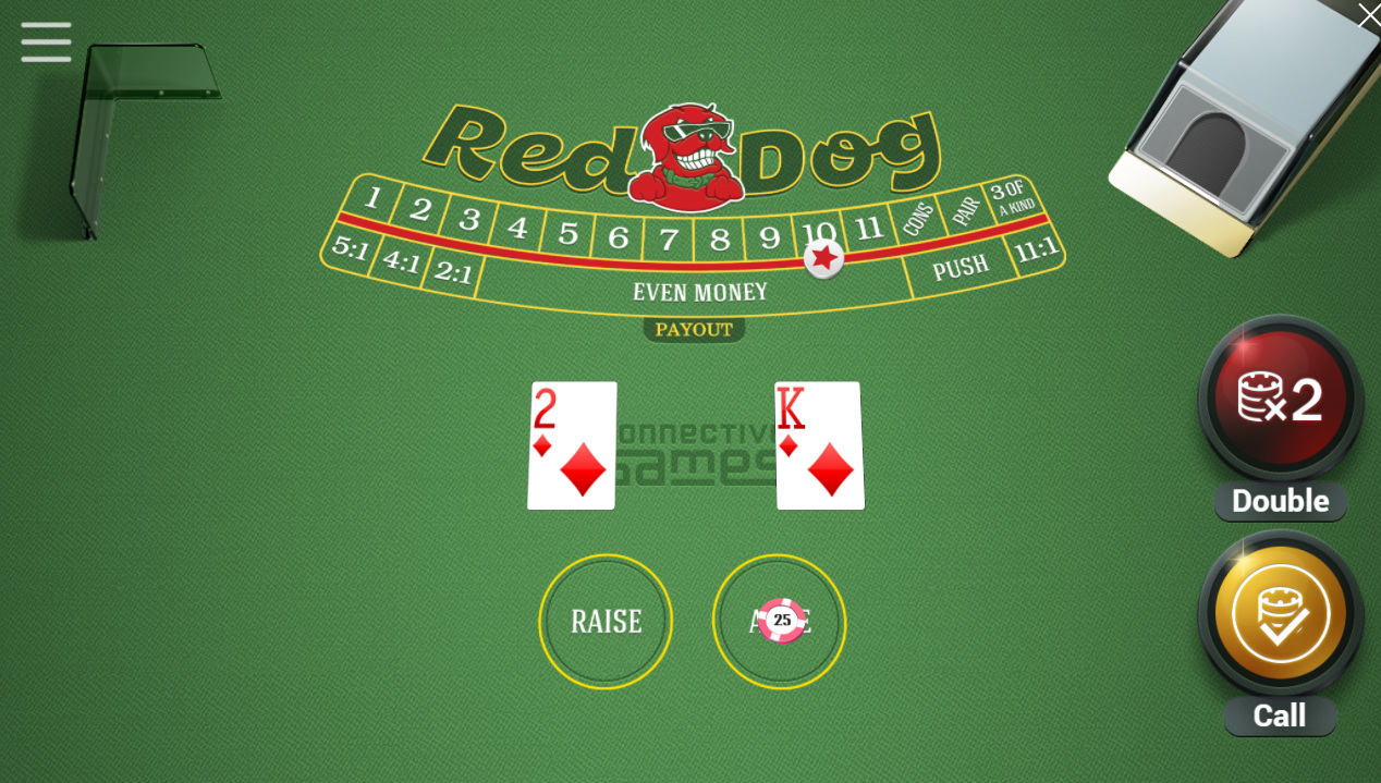 В игру Red Dog играют по обычным правилам с использованием шести колод карт. При правильной стратегии, которая заключается в повышении ставки на 7 или более карт, преимущество казино в основной игре составляет 2,798% от ставки Ante и 2,375% от суммарной ставки Ante и Raise.