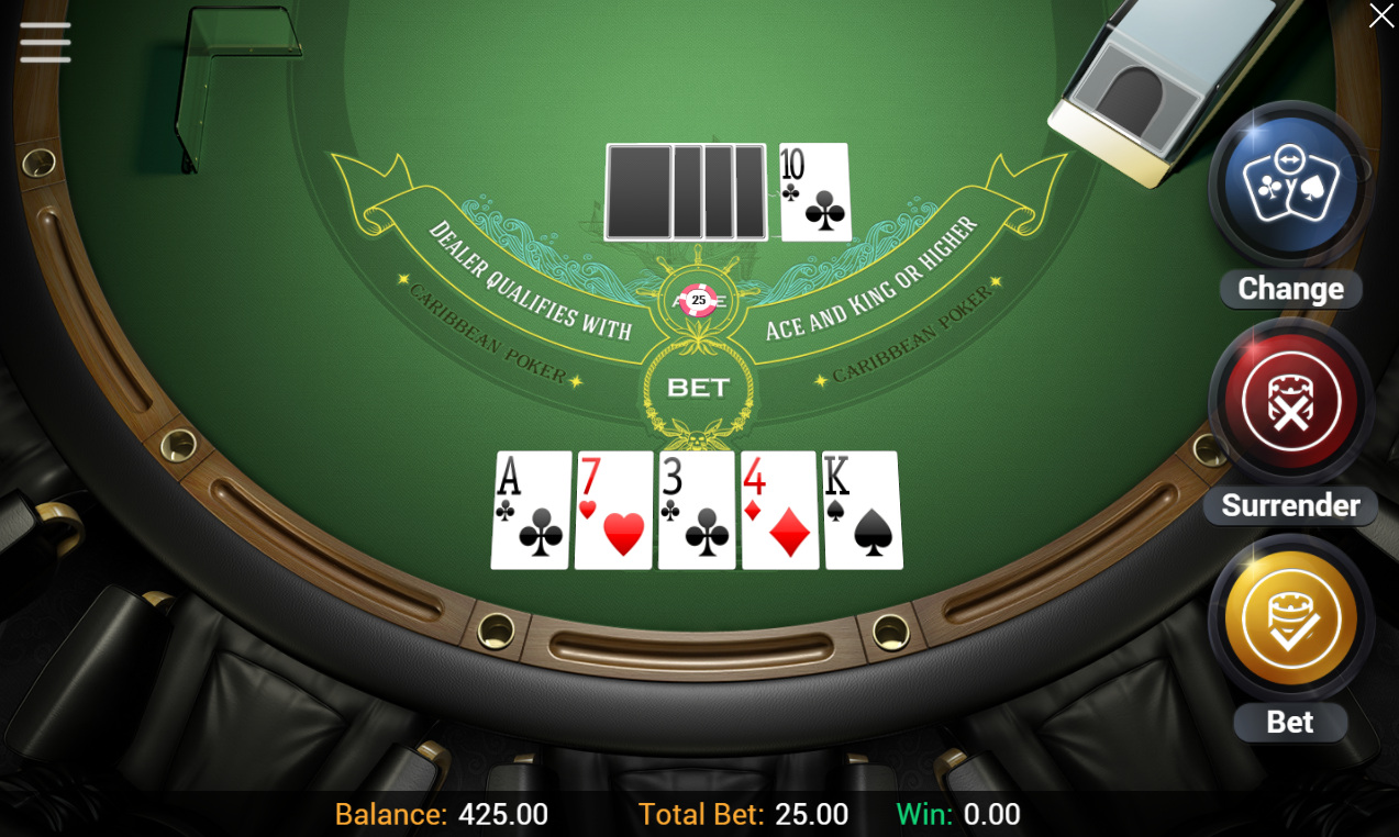 Карибский покер — это то, что в наземных казино называется карибским стад-покером . Используется стандартная американская таблица выплат 1-2-3-4-5-7-20-50-100. При оптимальной стратегии преимущество казино составляет 5,22% от ставки анте и 2,56% от суммы анте и рейза. Дополнительные ставки отсутствуют.