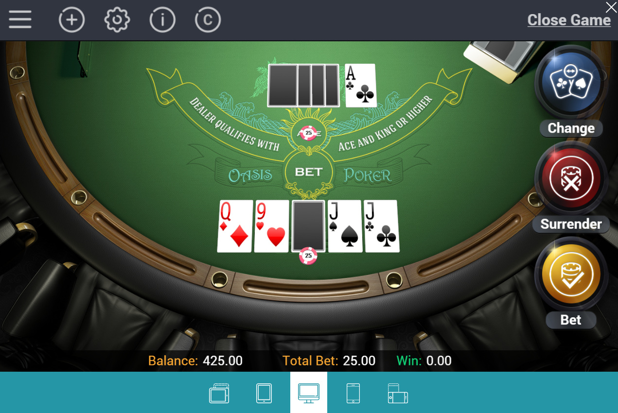 Для тех, кто не знаком с игрой, Oasis Poker — это то же самое, что и Caribbean Stud Poker, за исключением того, что игрок может обменять карту за сумму анте, прежде чем принять решение о повышении ставки или сбросе карт. Игрок может обменять две карты одновременно за двойную стоимость анте, но правильная стратегия предполагает, что никогда не следует обменивать две карты.