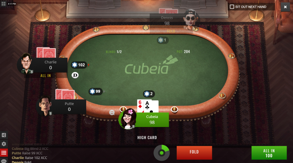 На сайте Cubeia указано, что они предлагают покерную игру «игрок против игрока» под названием «Ва-банк или фолд», что, очевидно, и означает именно это. Разрешены только ставки «ва-банк», и все ставки делаются до флопа. Очень интересно! Это потребовало бы сложного математического анализа.