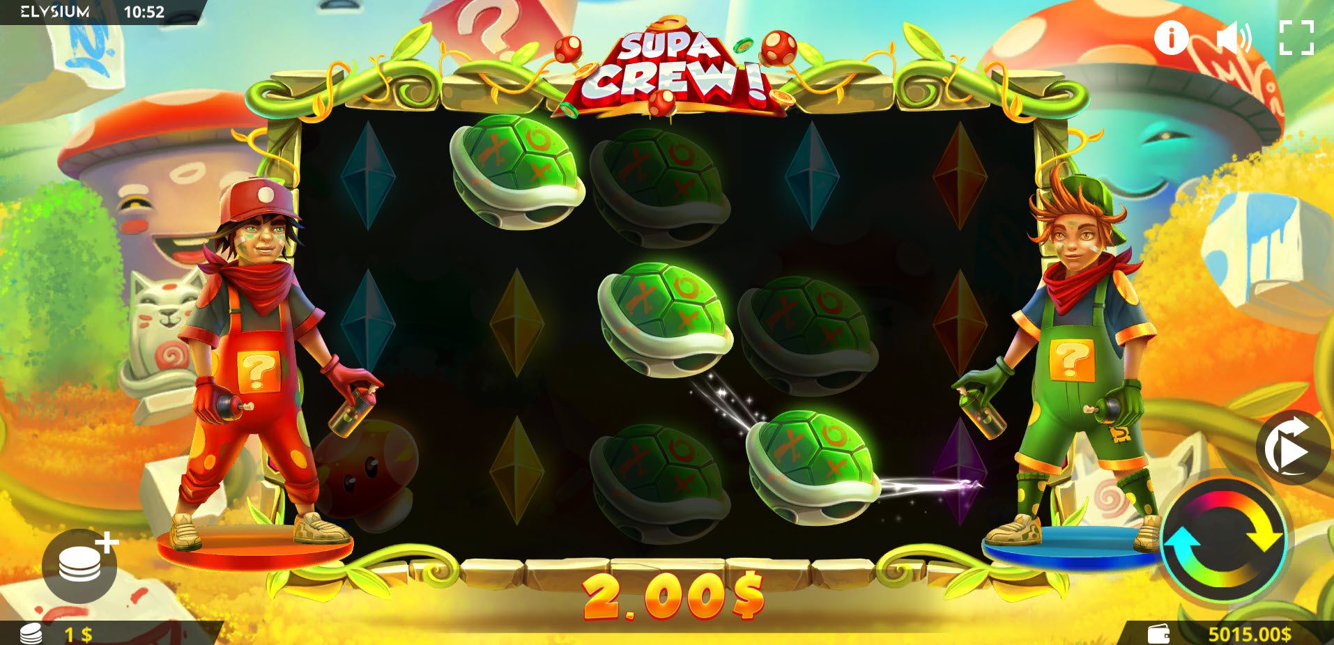 - Supa Crew — В этой игре с пятью барабанами много символов «монет», которые переворачиваются, открывая случайный символ. Если игрок получает несколько монет за один спин, все они переворачиваются, образуя один и тот же символ. Также есть супермонеты, которые покрывают квадрат 3x3 на экране монетами. Кроме того, есть символы-множители 2x2, которые приносят случайный выигрыш. Наконец, есть Supa Crew Bothers, которые превращают некоторые проигрышные символы в выигрышные.