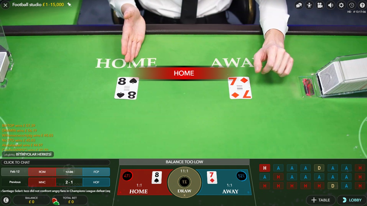 Football Studio математически идентична Dragon Tiger. В данном случае на карточке отображаются «домашняя» и «гостевая» команды. При ничьей проигрывает половина. Ниже представлены доступные ставки: