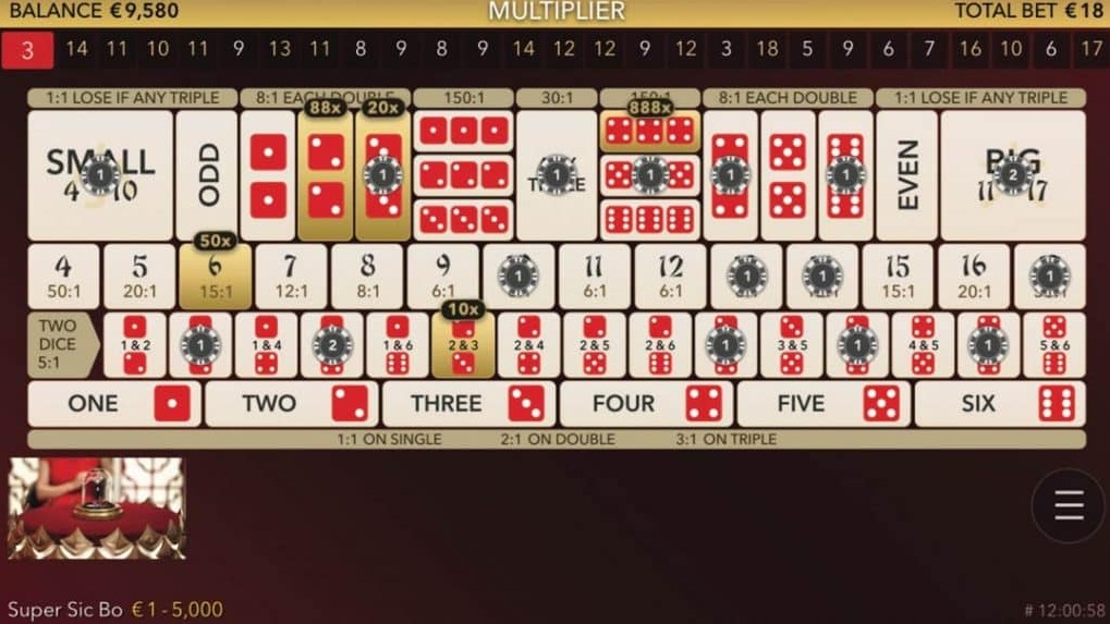 Игра Lightning Dice практически идентична сик бо (см. ниже), за исключением того, что в ней участвует живой дилер, а диапазон выплат отличается, как показано ниже: