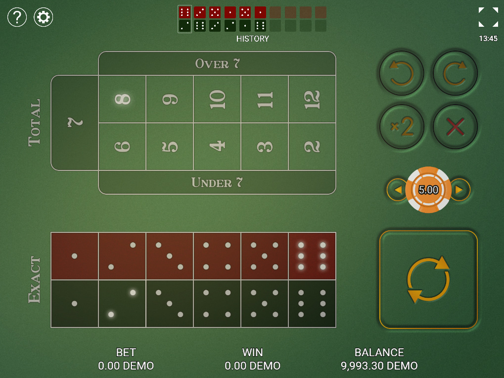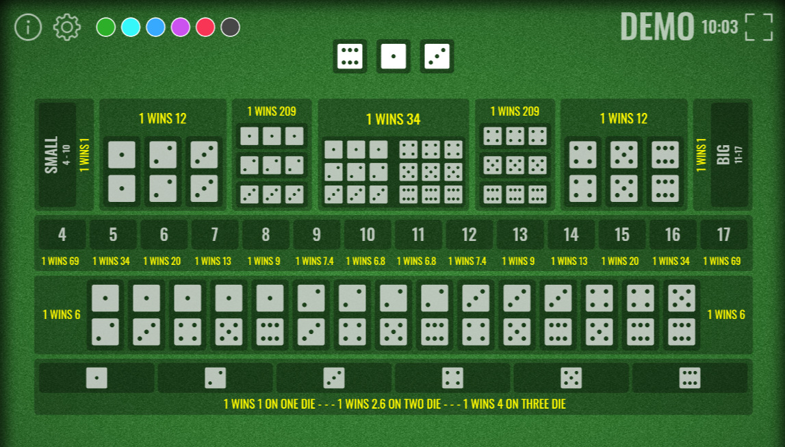 На выпадение красного или черного кубика делается по шесть ставок. Каждая ставка приносит выигрыш в размере 5,83 за 1 ставку, что составляет преимущество казино в 2,83%.
