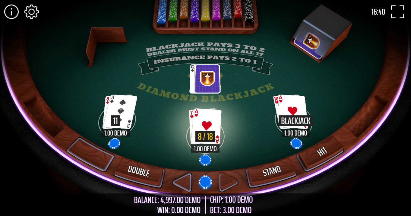 В игре в блэкджек три точки для ставок, и я бы сказал, что правила средние для индустрии. Мой калькулятор преимущества казино в блэкджеке показывает преимущество в 0,40%, хотя в справочном файле игры указано 0,35%. Вы можете сами решить, кому верить.