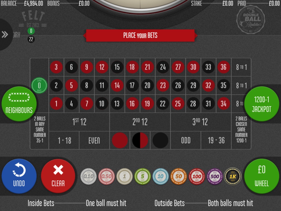 Рулетка с двумя шарами — это именно то, что подразумевает название: рулетка с двумя шарами. В отличие от аналогичной игры в отеле Tropicana в Лас-Вегасе, здесь используется колесо с одним нулем. Поэтому мне пришлось пересчитать все свои данные. Преимущество казино колеблется от 2,77% до 12,27%, поэтому будьте осторожны с тем, на что вы делаете ставки. Все правила и анализ вы найдете на моей странице, посвященной рулетке с двумя шарами . Прокрутите вниз до раздела, посвященного колесу с одним нулем.