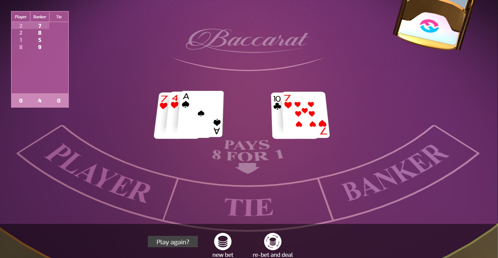 В игре в баккара FunFair всё сводится к основам: ставки на Игрока, Банкира и Ничью. В справочном файле утверждается, что используется бесконечное количество колод, но указанные в справочном файле показатели выигрыша соответствуют игре с шестью колодами. Вам придётся самим решить, чему верить. Вот данные о преимуществе казино в обоих направлениях.