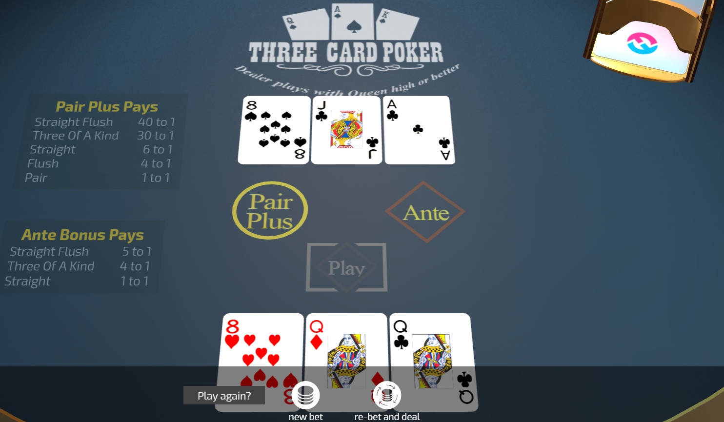 В Three Card Poker удачно используется щедрый бонусный анте 1-4-5 и таблица выплат Pairplus 1-4-6-30-40. В результате преимущество казино составляет: