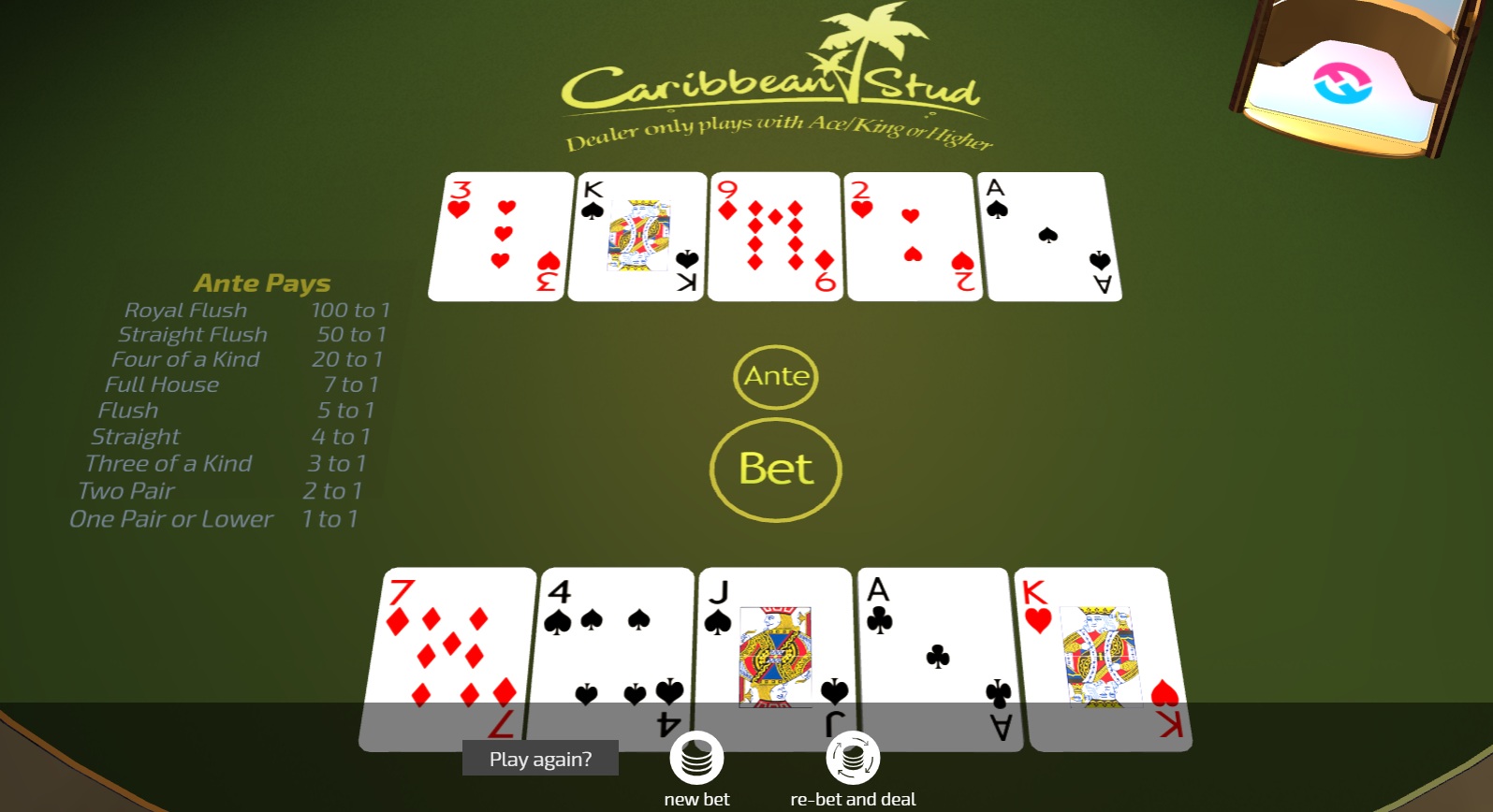 В FunFair используется обычная для Caribbean Stud Poker таблица выплат 1-2-3-4-5-7-20-50-100, с преимуществом казино в 5,22%. Странно, но отсутствует дополнительная ставка, она основана только на руке игрока.