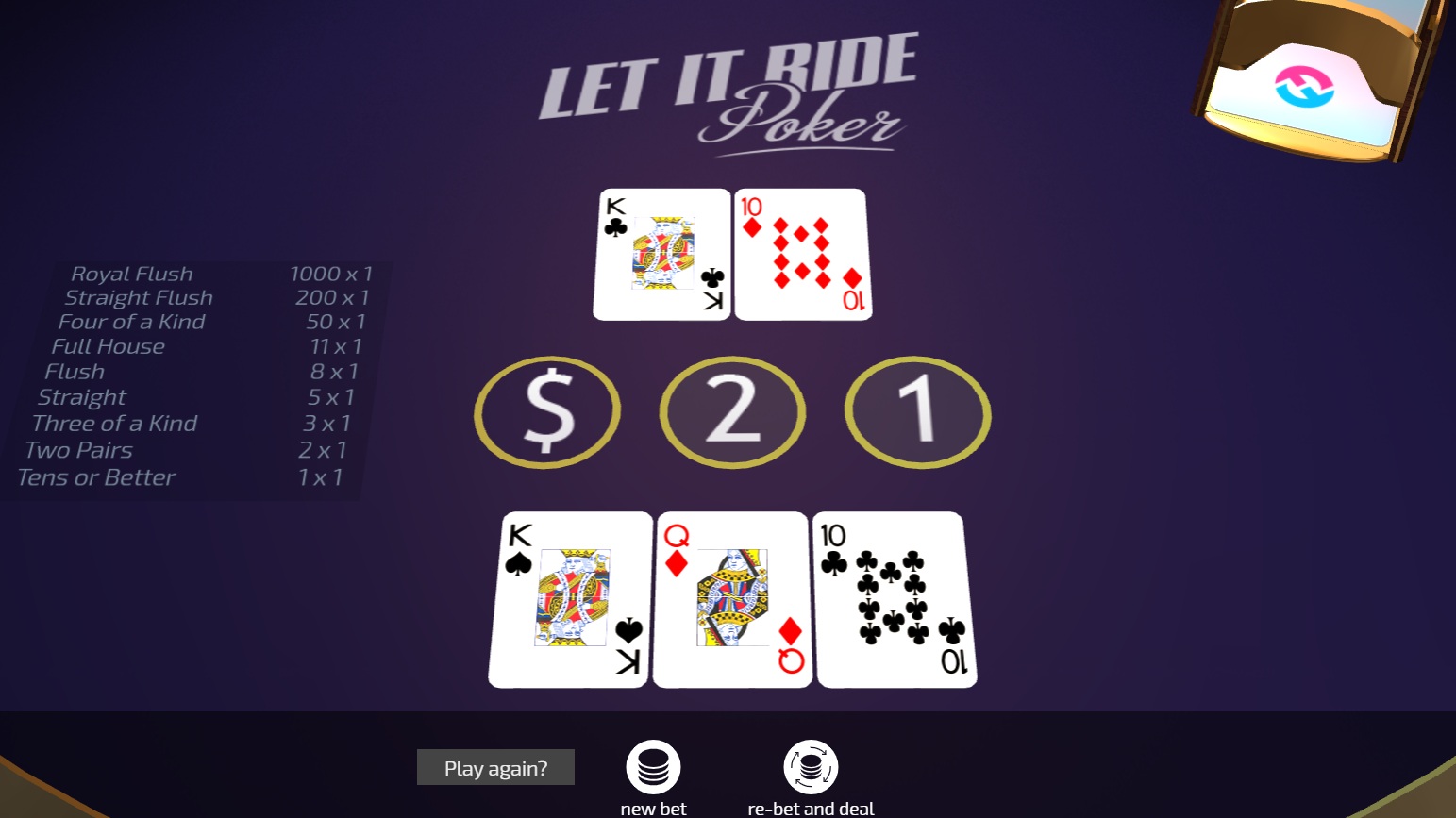 В игре FunFair используется обычная для Let it Ride таблица выплат 1-2-3-5-8-11-50-200-1000, что обеспечивает преимущество казино в 3,51%.