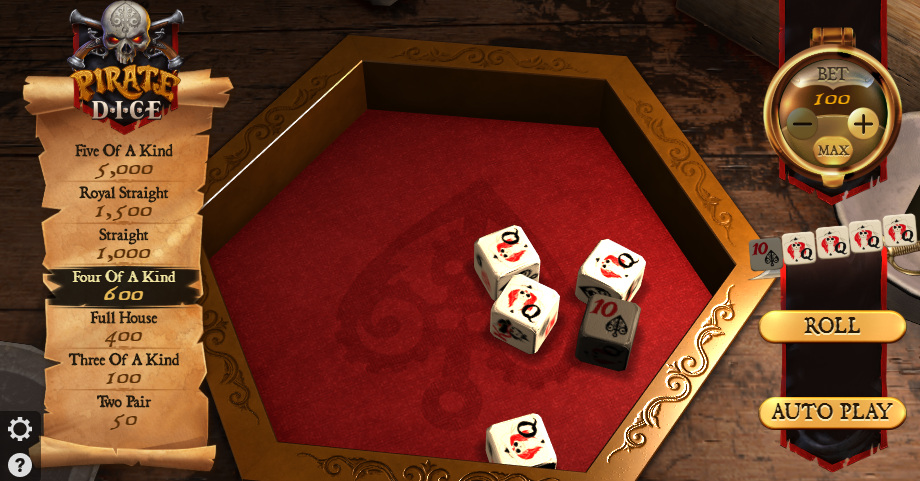 «Пиратские кости» — это простая игра, основанная на броске пяти покерных костей. Делается только одна ставка, и никаких решений принимать не нужно. Игрок получает выигрыш в зависимости от значения пяти костей в покере. Ожидаемая доходность составляет 96,45%. Более подробную информацию можно найти на моей странице, посвященной игре «Пиратские кости» .