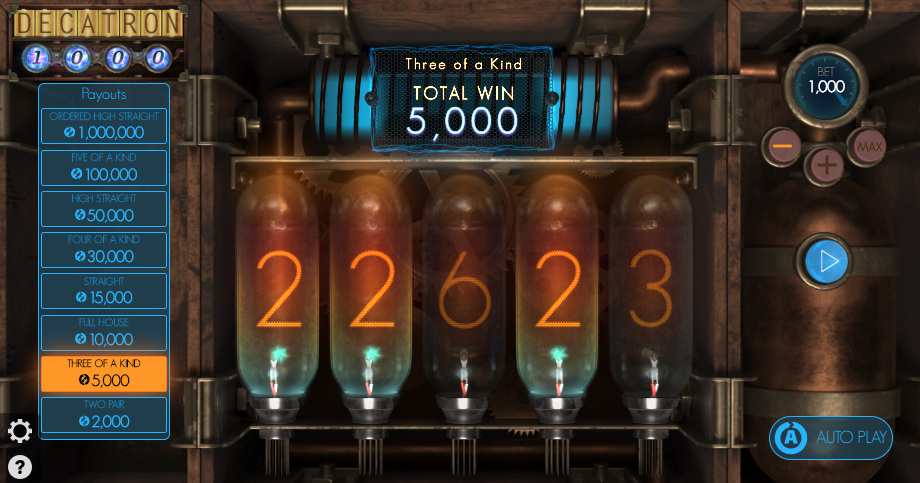 Decatron — это простая «мгновенная» игра от Funfair Technologies. Ставка делается всего один раз, а выигрыш зависит от значения случайного числа от 0 до 99999. Итоговая прибыль составляет 97,05%. Все правила и анализ игры вы найдете на моей странице, посвященной Decatron .