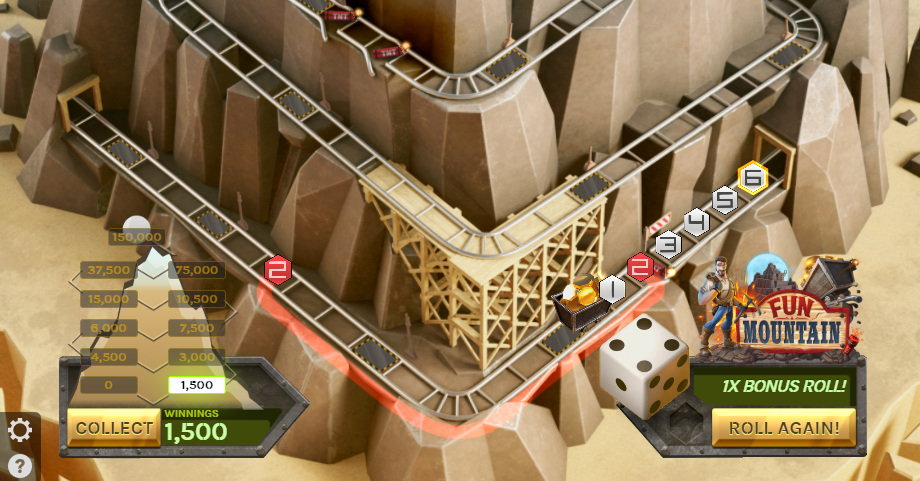 В игре Fun Mountain нужно бросить кубик, чтобы переместить вагонетку по трем уровням рельсов на горе. Правила довольно сложные, поэтому прошу прощения, если я не буду вдаваться в математические расчеты. В справочном файле указано, что ожидаемая доходность составляет 95,52%.
