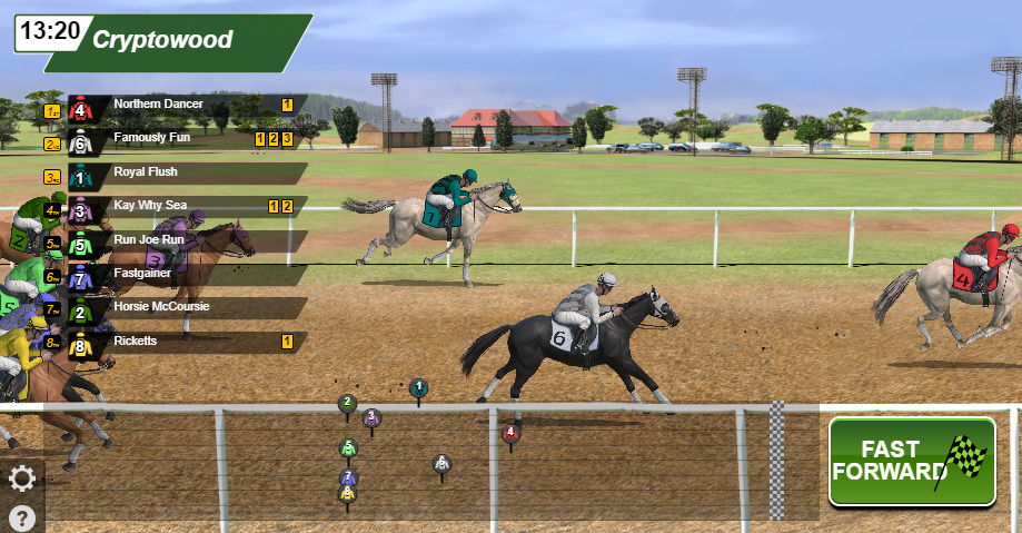 Derby Day Horses — это простая игра в стиле скачек «дерби». В игре представлено восемь лошадей и три классических способа делать ставки: победа, призовое место и третье место. После подсчетов я обнаружил, что процент возврата составляет от 96,7% до 96,9%. В справочном файле указан процент возврата в 97%.