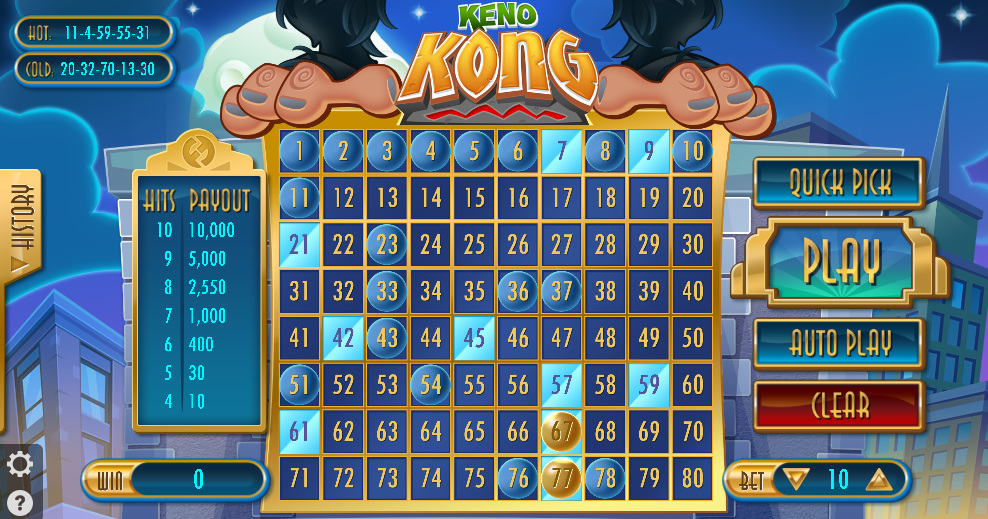В FunFair свою игру в кено называют Keno Kong. В ней действуют обычные правила: из 80 шаров разыгрывается 20. В следующей таблице показана таблица выплат за выбор от 3 до 10 шаров и сумма выигрыша за каждый выбор.