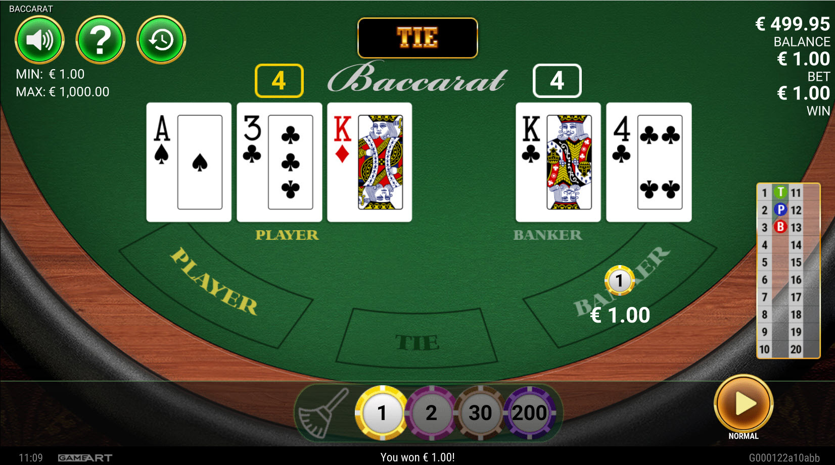 Игра в баккара была очень простой. Предлагались три основные ставки с обычными коэффициентами — Игрок, Банкир и Ничья.