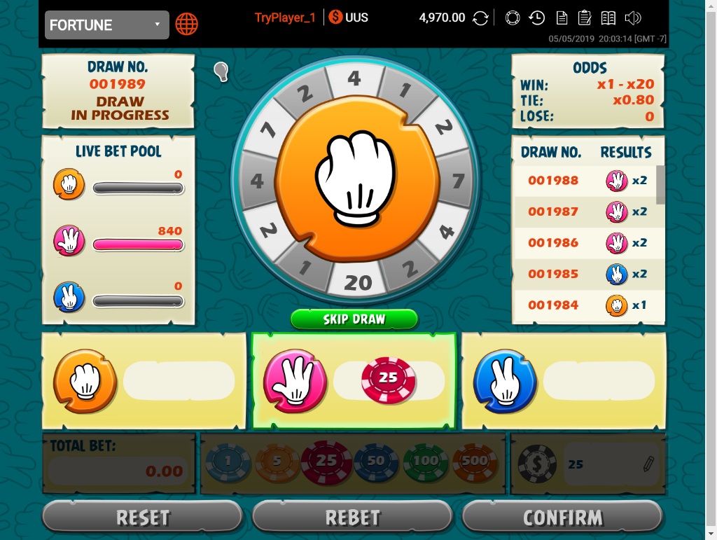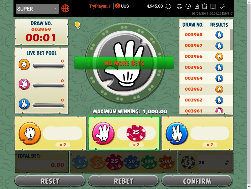 Существует две версии игры «Камень, ножницы, бумага». Классическая и Суперверсии играют по традиционным правилам, за исключением того, что ничья оплачивается к 0,9 к 1. В версиях «Счастливая» и «Удача» для определения выигрыша используется колесо, и ничья оплачивается к 0,8 к 1. Не поддавайтесь искушению большими числами на колесе. Выборка из 105 игр показывает средний выигрыш всего 1,92, что дает общую прибыль в 90,79%.