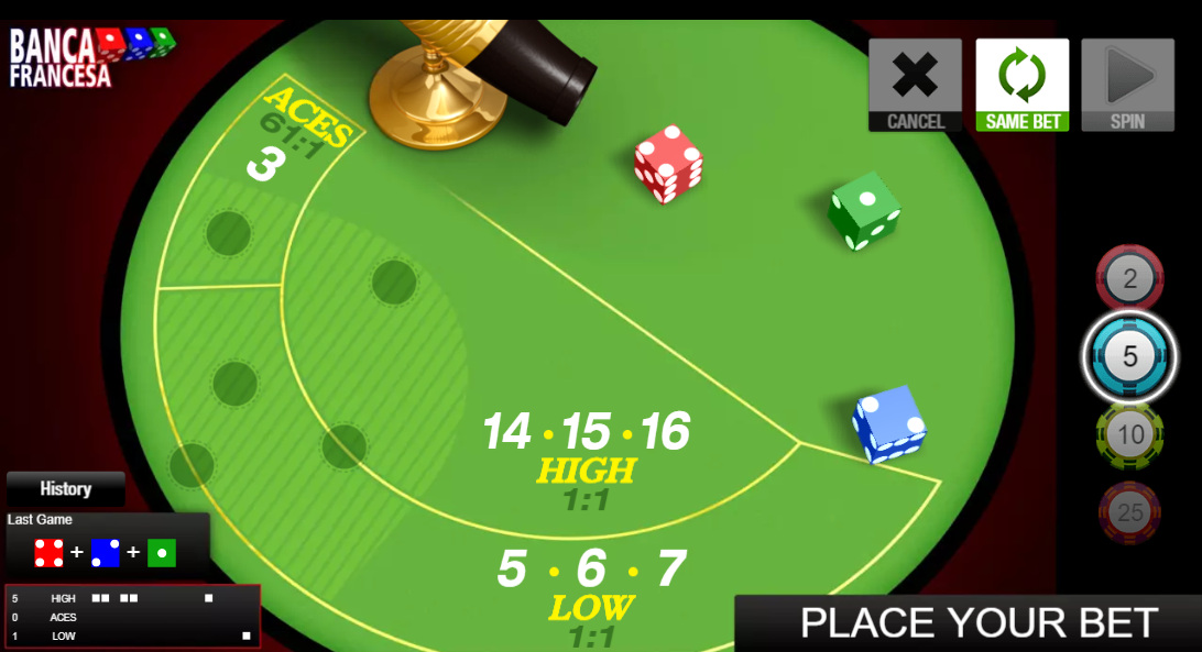 Banca Francesa — это португальская игра в кости. Её можно кратко описать как упрощённую версию сик бо . В игре всего три ставки, и преимущество казино составляет всего 0,46%, если ничья считается решённой, и 1,59%, если нет (ничьих бывает много). Полные правила и анализ игры вы найдёте на моей странице, посвящённой Banca Francesa .