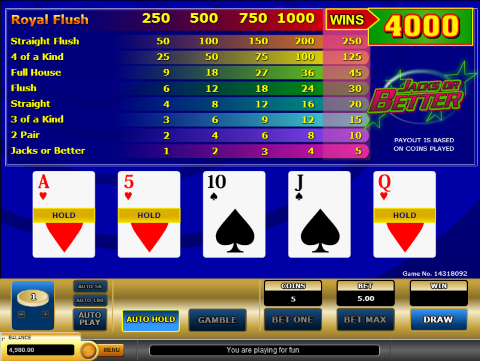 Используя мой анализатор раздач в видеопокере , мы видим, что при ставке в 5 монет правильной игрой является сохранение только туза и дамы. Возможно, стратегия верна и для ставок меньше максимального количества монет. AQ-5 была бы правильной игрой при ставке от одной до четырех монет. Однако, как вы видите, я поставил пять монет.
