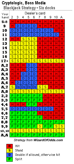Ниже представлена базовая стратегия для игры с шестью колодами, одинаковая для программного обеспечения Cryptologic и Boss Media, также использующего шесть колод.
