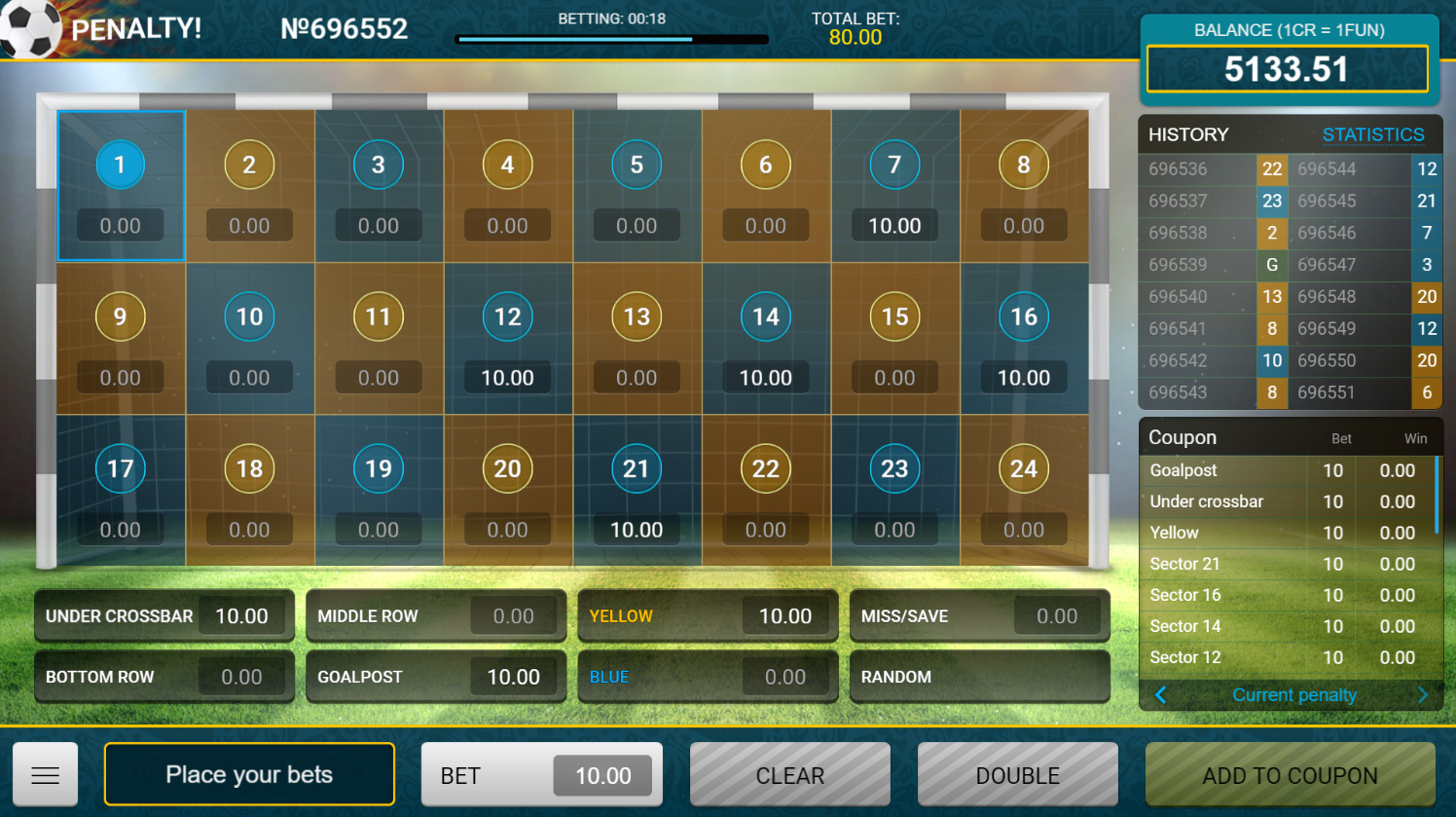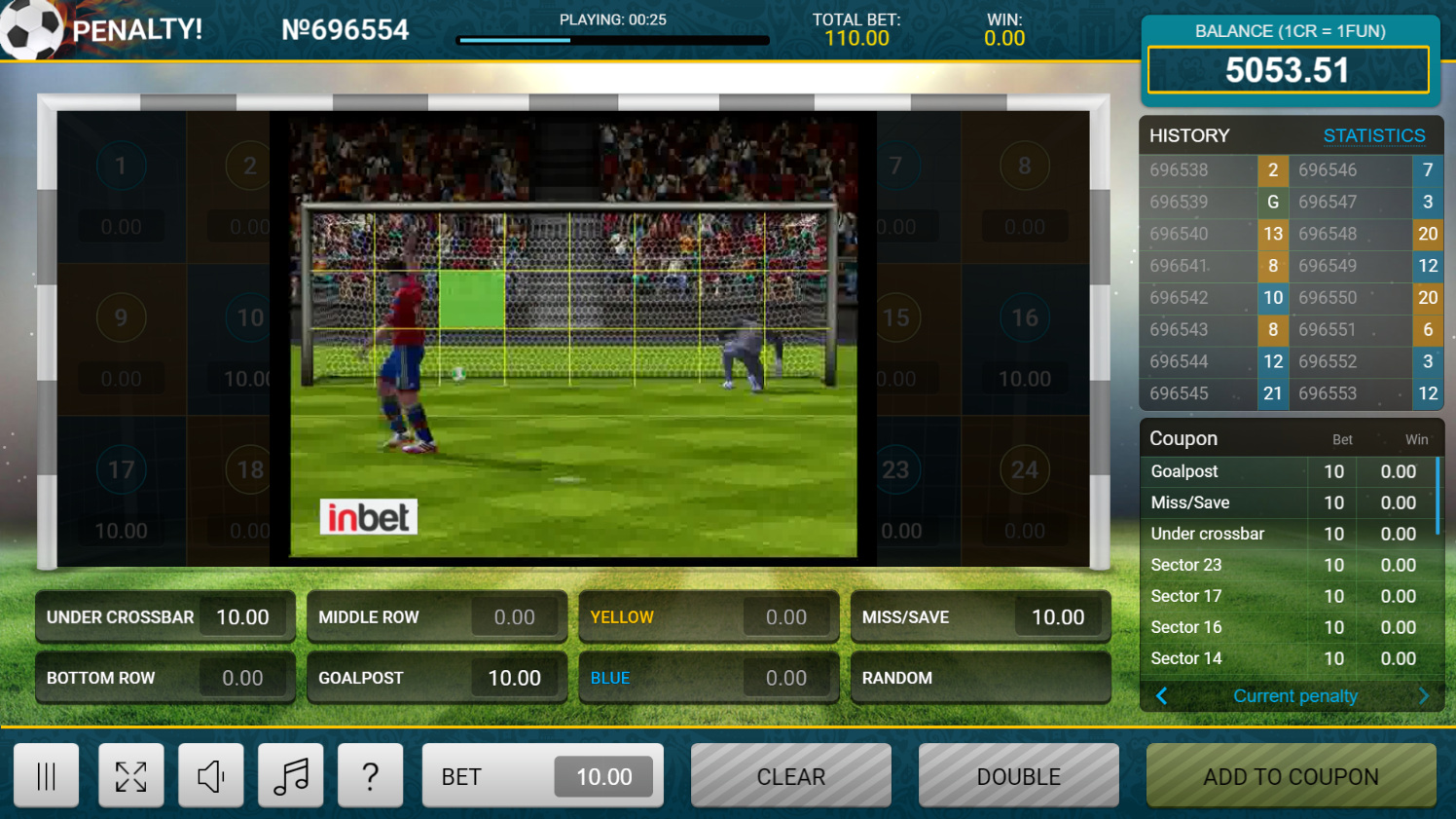 Эта игра математически идентична рулетке с 19 номерами или игре Fortune 18 от InBet. В этой версии игрок может делать ставки на числа от 1 до 18 различными способами или на «сэйв». После периода ставок имитированный мяч будет забит в ворота размером 6х3, пронумерованные от 1 до 18. Однако существует также вероятность того, что вратарь заблокирует удар, что называется «сэйвом», вероятность которого, как я предполагаю, составляет 1/19. Математически, преимущество казино в этой игре составляет 1/19, или 5,26%, на каждую ставку.