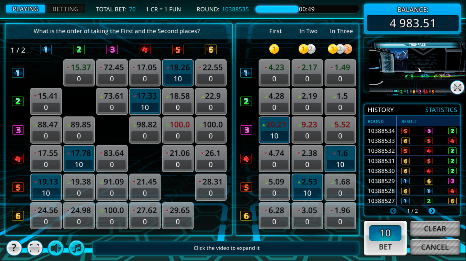 Tron Race — это, по сути, обёртка для Dogs 3D . Вместо собачьих бегов здесь виртуальные гоночные автомобили, как в фильме. Я получаю одинаковую общую прибыль в 92,2% для ставок на победу, призовое место и попадание в тройку лидеров. Для одной из гонок, которую я изучал, средняя прибыль от ставки на экспресс составила 91,6%. Я подозреваю, что ограничение на выигрыш в 100 может привести к тому, что средняя прибыль от ставки на экспресс будет варьироваться от гонки к гонке. Я бы также посоветовал не делать ставки на выигрыш в 100, на случай, если коэффициенты выше и округляются в меньшую сторону.