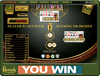 Используется американская таблица выплат, за исключением того, что за роял-флеш выплачивается 250 вместо 100. Это снижает преимущество казино с 5,22% до 5,20%. Также доступна прогрессивная дополнительная ставка с таблицей выплат 100%/10%/$500/$150/$100. Точка безубыточности для дополнительной ставки составляет 159 810,53 фунта стерлингов.