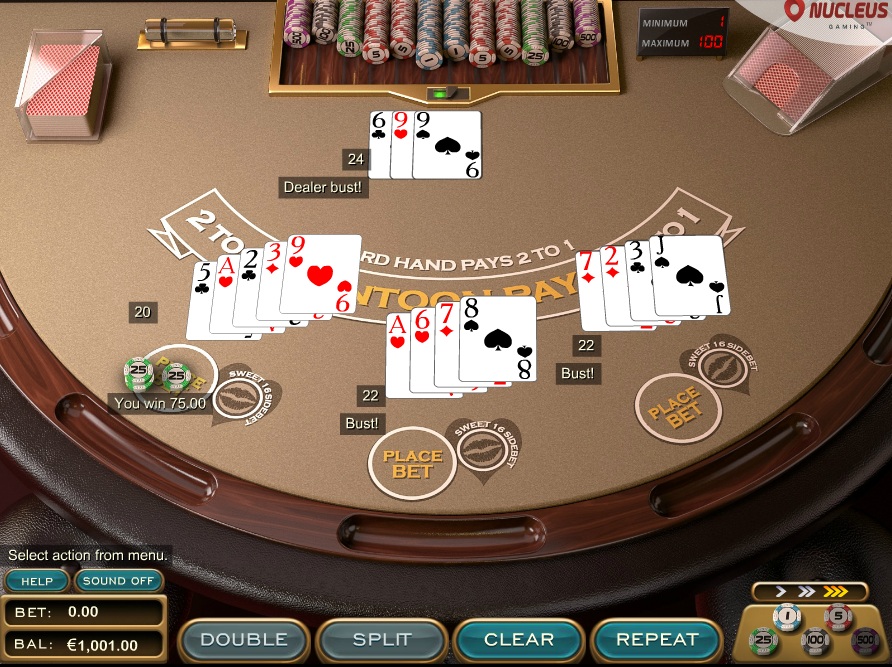 В Nucleus действуют обычные правила, разрешающие разделение тузов при доборе карт и брать карту дилером при мягкой 17. Используется восемь колод. В результате преимущество казино составляет 0,38%. Дополнительная ставка «Sweet 16» имеет преимущество казино в 2,52%.