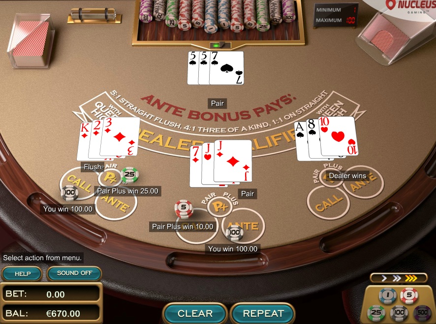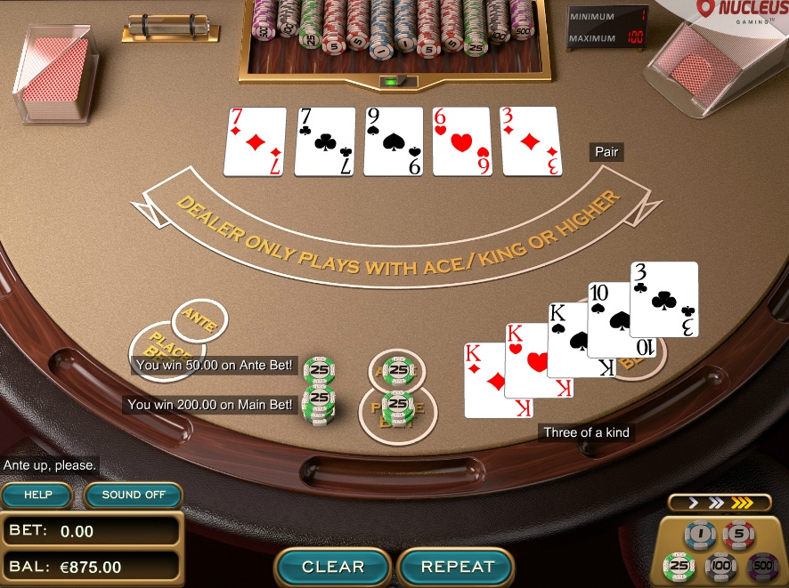 В Nucleus свою игру в Three Card Poker называют Triple Edge Poker. Бонус Ante рассчитывается по таблице выплат 1-4-5, что дает преимущество казино в размере 3,37% от ставки Ante. Таблица выплат Pairplus составляет 1-4-6-30-40, что дает преимущество казино в размере 2,32%.