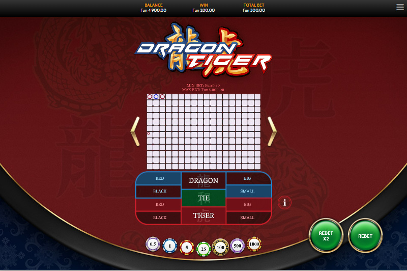 Игра «Дракон и Тигр» следует стандартным правилам. Игрок может делать ставки на победителя, ничью, а также на то, будет ли каждая сторона красной или черной, и высокой или низкой. Ставка на ничью выплачивается 10 к 1 (что лучше, чем у некоторых конкурирующих программ, которые выплачивают только 8 к 1). Также есть табло, что наводит на мысль, что игра ведется из колоды. Возможно, ставки на цвет и высокую/низкую сторону можно подсчитать (заткнись, Виз!), но я оставлю это на усмотрение читателя.
