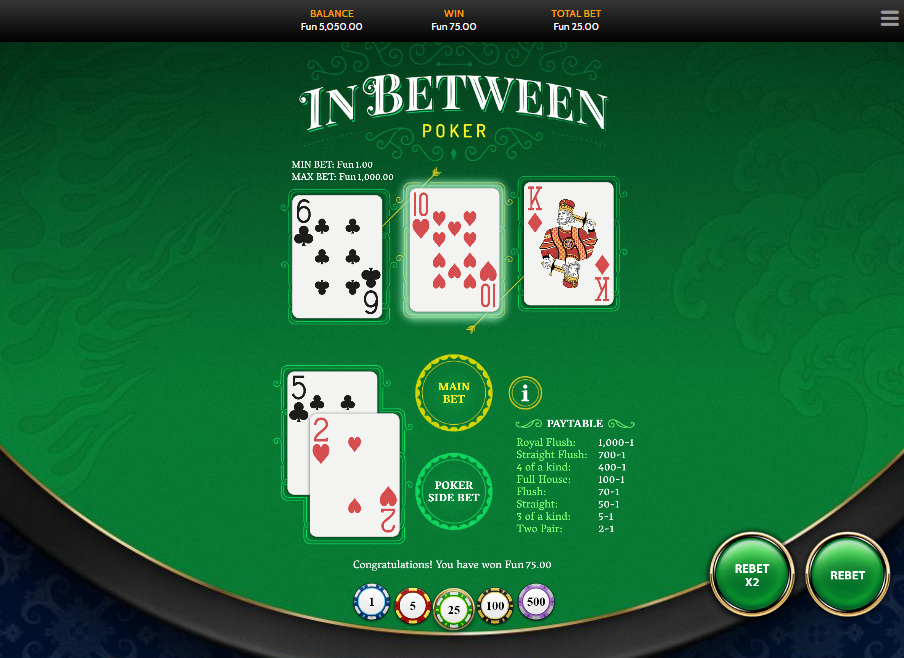 Насколько мне известно, In Between — это уникальная игра от OneTouch. В ней три карты выкладываются в ряд, и выигрывает игрок, если средняя карта оказывается между левой и правой картами по рангу. Также существует вариант с двумя картами, позволяющий выиграть. Для получения дополнительной информации перейдите по ссылке.
