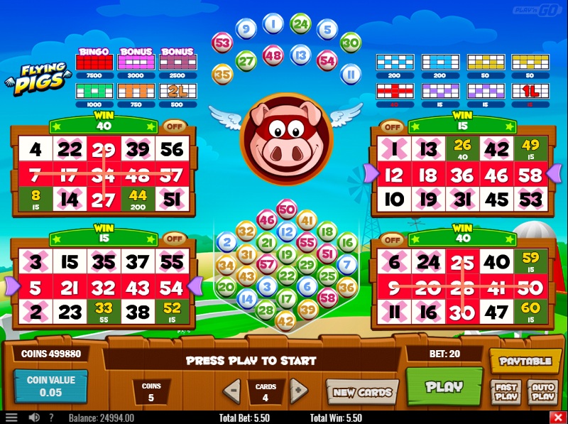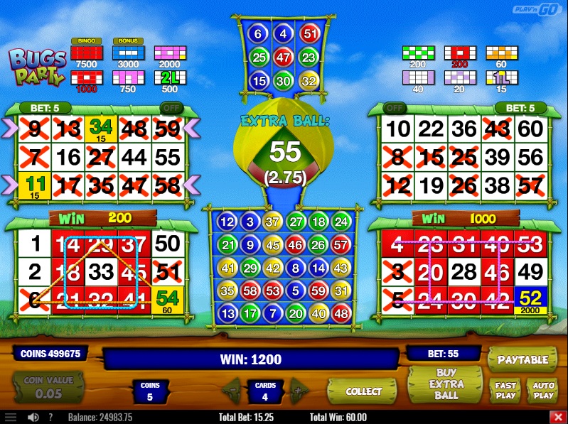 Существует две похожие игры в бинго. В обеих используются карточки размером 3 на 5. В обеих есть возможность докупить множество дополнительных шаров, если вам не хватает одного шара до крупного выигрыша. В обеих также есть бонусная игра за заполнение сложной комбинации. В справочных файлах указано, что процент возврата в обеих играх составляет 96%.
