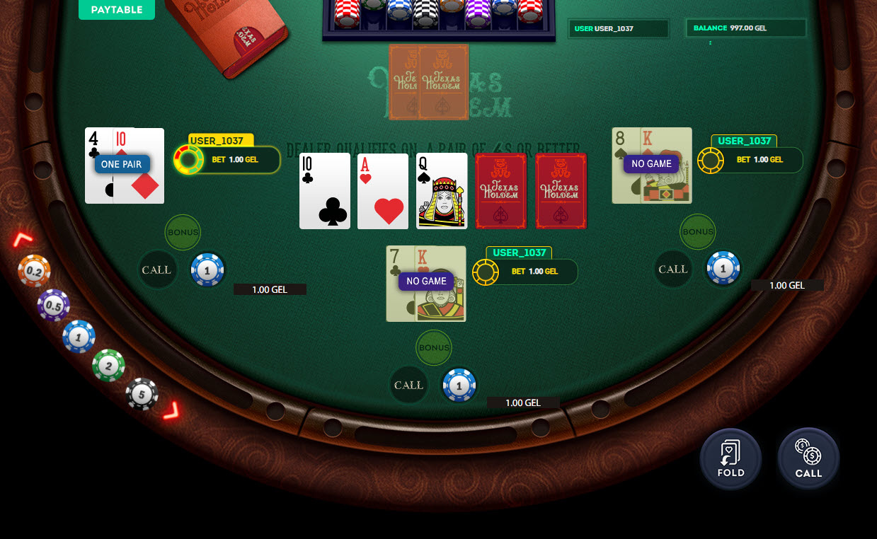 Компания SmartSoft называет свою игру Casino Hold 'Em "Техасский Холдем". Они используют щедрую таблицу выплат 100-20-10-3-2-1, что обеспечивает преимущество казино в 0,35%. Для дополнительных ставок используется таблица выплат 100-25-25-25-7-7-7-7, что обеспечивает преимущество казино в 6,40%.