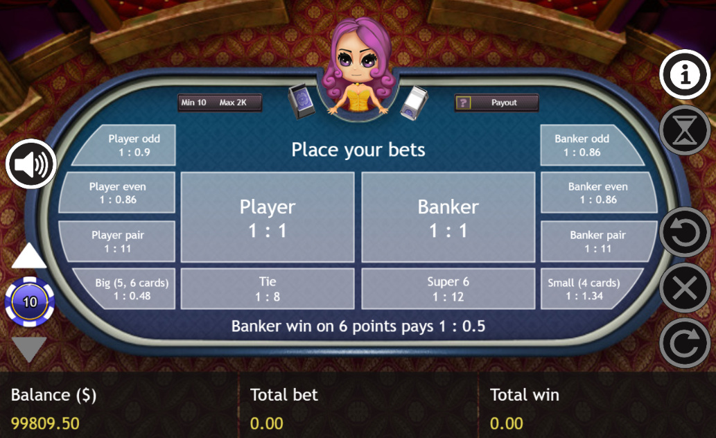 В баккара действуют стандартные правила, выигрыш по ставке «Банкир» составляет 0,95. Есть несколько дополнительных ставок, которые точно такие же, как в разделе «Супер 6» ниже. В итоге, единственное отличие заключается в том, что преимущество казино по ставке «Банкир» составляет 1,06% против 1,46% в «Супер 6», и в «Супер 6» нет дополнительной ставки.